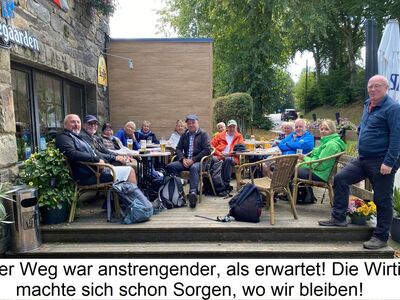 Am nächsten Tag Wanderung zum Fahrstuhl zur Burg Altena. Hier ließ es sich BM Uwe Kober nicht nehmen, die Gäste zu begrüßen. Nach einer Besichtigung der Burg nebst Weltjugendherberge ging es zum Kreishaus in Lüdenscheid. Der Kreis MK hatte die Gäste zum Mittagessen eingeladen, mit anschließender Begrüßung durch Kreisdirektorin Barbara Dienstel-Kümper. In recht humorvoll unterhaltsamer Art informierte sie die Gäste über die industrielle Geschichte, aber auch über die Kulturlandschaft des erst in dieser Form seit 50 Jahren bestehenden Kreises. Danach Fahrt mit dem ÖPNV nach Herscheid, wo bereits die dortigen Wanderfreunde warteten. Gemeinsam wanderten wir bei strahlendem Sonnenschein zur Nordhelle, der höchsten Erhebung im MK. Nach Rast mit Pressetermin ging es weiter Richtung Stottmart. Hier hatten die Herscheider Wanderfreunde Renate und Eckhard Albrecht, unterstützt von weiteren SGVern, zum Grillabend eingeladen.