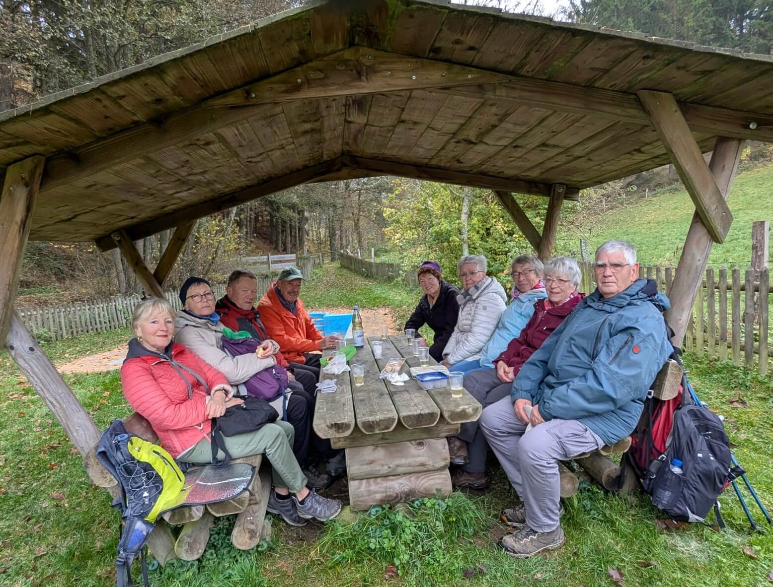 Wir machten uns mit Regenschirmen bewaffnet trotzdem auf den Weg. Reibekuchen lockte! Mit bester Laune wanderten wir über die Rauhe Hardt zu unseren SGV-Freunden nach Letmathe und wurden belohnt. Schon nach wenigen Minuten ließ der Regen nach, und es blieb dann den ganzen Tagen zwar bewölkt, aber trocken.